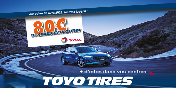 Dotations en chèques carburant Total Jubiléo offerts par Toyo Tires. Valable pour toute personne physique ayant acheté et monté les pneus sur un même véhicule le même jour, après validation du dossier par Toyo Tires et dans le respect des conditions et modalités de l’opération. Modalités et conditions de l’opération sur : www.toyotires.fr/promo
